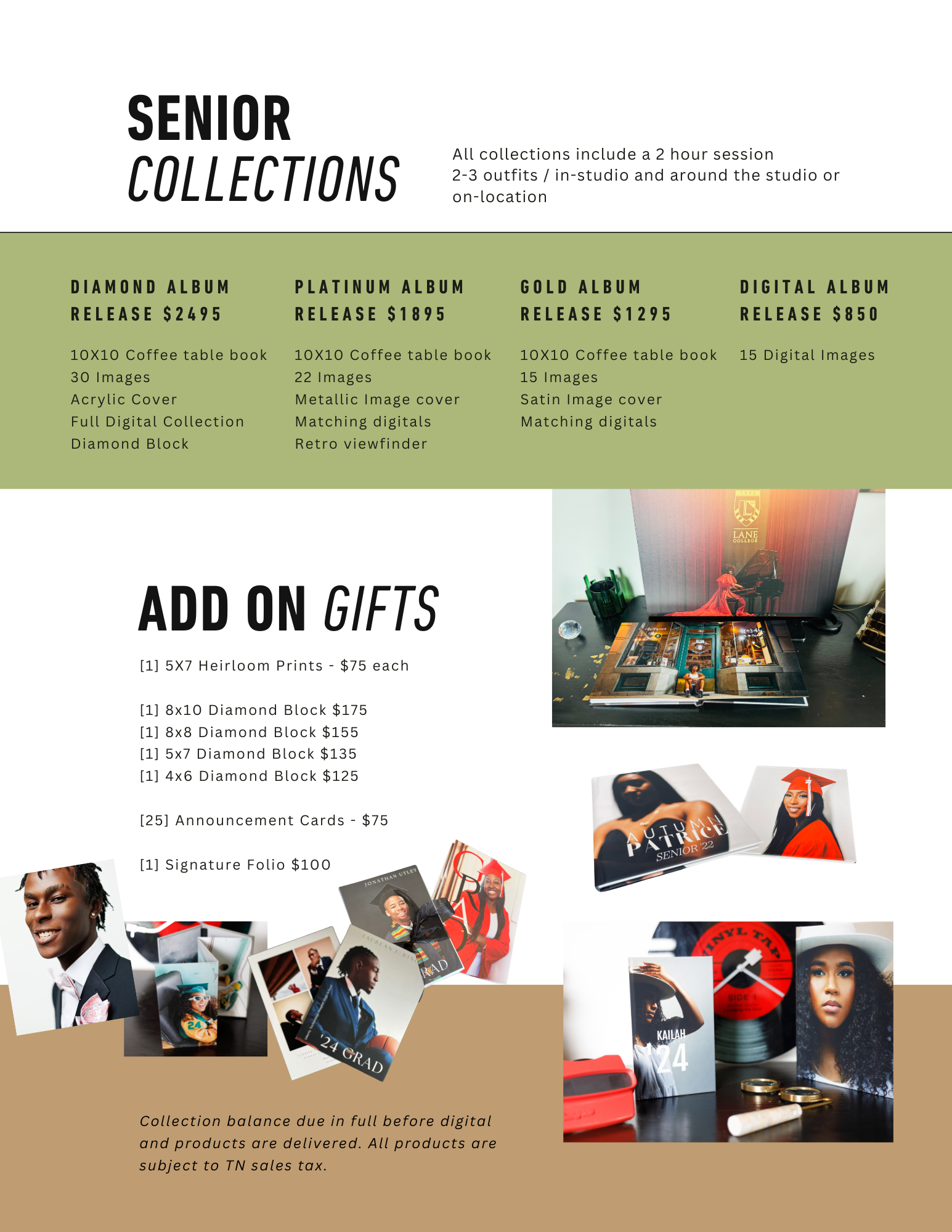 All prints and photo products are professional grade and made to last a lifetime. Crafted by artisans from archival-quality materials, we offer nothing but the very best in color reproduction and craftsmanship to our clients. The Senior Experience allows you to choose a collection and add on a la carte to fit your needs. Payment installments are available on collections with our payment program.